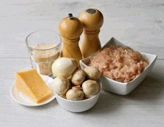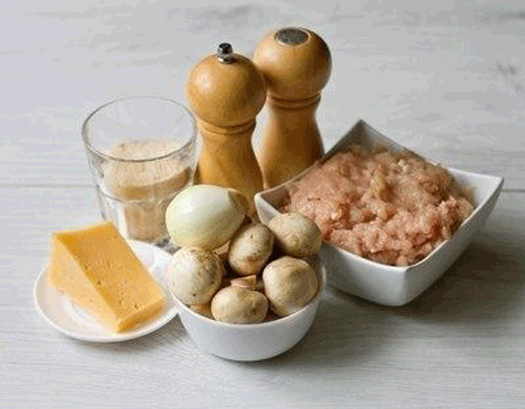 Фарш приправляем солью и перцем. Шампиньоны нарезаем пластинками, мелко рубим лук, сыр трем на крупную терку.